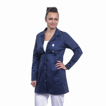 Klasyczny krój w nowoczesnym wymodelowanym fasonie z długim rękawem, dodatek elastanu sprawia, że idealnie układa się na każdej sylwetce i znacząco podnosi komfort noszenia. Rozpinany, wykończony rewersem, po bokach dwie kieszonki wpuszczane, górna mała kieszonka podwójna. Z tyłu pasek regulowany na springi z grawerem MEDIFACE . Doskonale sprawdzi się zarówno w gabinetach lekarskich jak i salonach kosmetycznych.